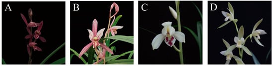 C. ensifolium ‘Mo bao’ with purple-red sepals, ‘Shi zhang hong’ with red sepals, ‘Da feng su’ with yellow-green sepals, and ‘Ma jiang zhi yu’ with white sepals were used in this study (Figure 9). The wild plants were collected at the National Orchid Germplasm Resources of Fujian Agriculture and Forestry University (119°18′ E, 26°05′ N), Fuzhou, Fujian Province, China. All sepals were sampled and frozen in liquid nitrogen immediately and stored at −80 °C. Three biological replicates were used for all samples.