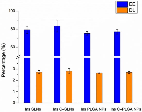 Encapsulation efficacy (EE) and drug loading (DL) of the prepared nanoparticles: Ins PLGA NPs, Ins C-PLGA NPs, Ins SLNs, and Ins C-SLNs. The ANOVA test was performed to check the significance of the differences between the results of the EE and DL. Measurements were performed in triplicate (n = 3 independent formulations), and data are represented as means ± SD.
