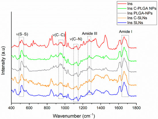 The structural changes of insulin after the preparation of NPs were investigated using Raman spectroscopy. The Raman spectra of insulin-containing NPs were compared with the native insulin’s spectrum (Figure 3).