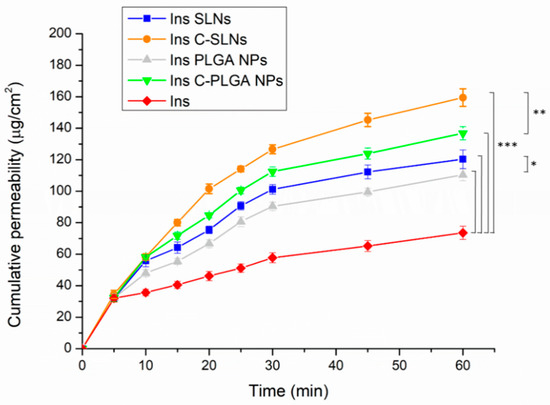 Characteristically, the diffusion of both Ins SLNs and Ins C-SLNs was significantly higher than in the case of Ins PLGA-NPs (p < 0.05) and Ins C-PLGA NPs (p < 0.01). This could be the result of the higher lipophilicity of Ins SLNs [49] in comparison with Ins PLGA NPs [48]. Moreover, the chitosan-coating of the NPs led to a significantly better (p < 0.001) membrane diffusion and this might be a result of the permeation enhancer properties of chitosan [50].