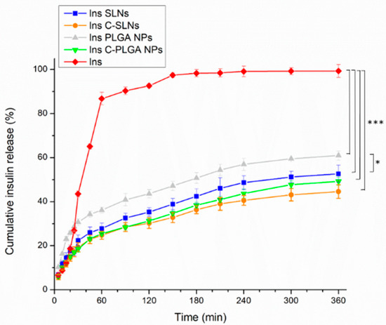 The dissolution behavior of the native insulin and the insulin loaded nanoparticles (Ins PLGA NPs, Ins SLNs, Ins C-PLGA NPs, and Ins C-SLNs). The ANOVA test was performed to check the significance of the differences between the diffusion of the native insulin and the prepared NPs, * p < 0.05; *** p < 0.001. Measurements were carried out in triplicate (n = 3 independent formulations), and data are represented as means ± SD.