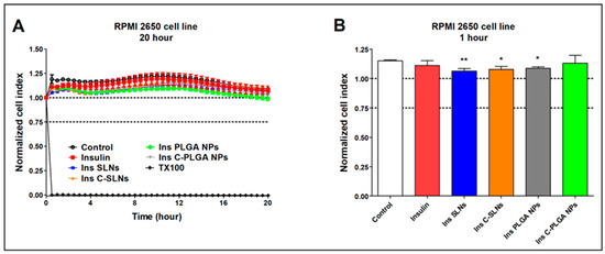 Cell viability of RPMI 2650 nasal epithelial cells after the treatment with insulin, insulin NPs, and HCl measured by impedance. The kinetic curve of cell viability during the 20-h treatment (A) and at the 1-h time point of the treatment (B). Values are presented as means ± SD, n = 6–12. Statistical analysis: ANOVA followed by Dunett’s test. TX-100: Triton X-100. * p < 0.05, ** p < 0.01 compared with the control group.