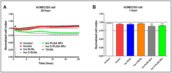 Cell viability of hCMEC/D3 endothelial cells after the treatment with insulin, Ins NPs, and HCl measured by impedance. The kinetic curve of cell viability during the 20-h treatment (A) and at the 1-h time point of the treatment (B). Values are presented as means ± SD, n = 6–12. Statistical analysis: ANOVA followed by Dunett’s test. TX-100: Triton X-100. *** p < 0.001 compared with the control group.