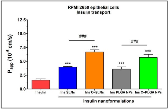 Apparent permeability coefficients (Papp) for insulin (0.07 mg/mL in all samples) when applied alone or in different formulations measured across RPMI 2650 epithelial cell layers after 1 h of incubation. Values are presented as means ± SD, n = 4. Statistical analysis: ANOVA followed by Bonferroni test. *** p < 0.001 compared with the insulin group, ### p < 0.01 compared between the indicated groups.