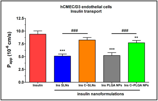 Apparent permeability coefficients (Papp) for insulin (0.07 mg/mL in all samples) when applied alone or in different formulations measured across hCMEC/D3 endothelial cell layers after 1 h of incubation. Values are presented as means ± SD, n = 4. Statistical analysis: ANOVA followed by the Bonferroni test. ** p < 0.01, *** p < 0.001 compared with the insulin group. ### p < 0.01 compared between the indicated groups. C-: Chitosan coated nanoparticle; NPs: Nanoparticles; PLGA: Poly (lactic-co-glycolic acid; SLN: Solid lipid nanoparticle.