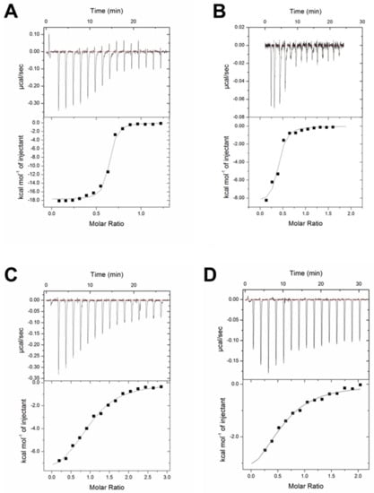 The resulting titration curves were fitted using the MicroCal Origin software, assuming one set of binding sites. Affinity constants (Ka) and enthalpy variations (ΔH) were determined, and the Gibbs energy (ΔG) and entropy variations (ΔS) were calculated from the equation: