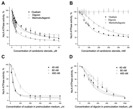 The plots describing the dependence of the NKA hydrolytic activity on CTSs concentration in the incubation medium were made using the Origin 8.1 program (OriginLab Corp., Northampton, MA, USA). They were fitted by hyperbola. The dependence of the Na,K-ATPase hydrolytic activity on the CTSs’ concentration in the preincubation media was fitted to the Hill 1 function:
