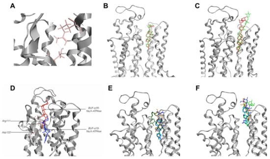 Cardiotonic steroids-binding site in Na,K-ATPase models. (A)—cardiotonic steroids (CTSs) binding site in α1R-Na,K-ATPase. Hydrogen bonds between Arg111 and Asp122 in α1R-Na,K-ATPase. (B,C)—verification of ouabain and digoxin position in CTSs-binding site of α1S-Na,K-ATPase. Comparison from X-ray 4HYT and 4RET structures with docking models: (B)—ouabain in 4HYT structure, (C)—digoxin in 4RET structure. CTSs from 4HYT or 4RET colored red, CTSs from docking models colored green. (D)—bufalin position in CTSs-binding site of α1S- (blue) and α1R-Na,K-ATPase (red). Models based on the 4HYT structure of Na,K-ATPase. (E,F)—CTSs positions in the CTSs-binding site of α1S-Na,K-ATPase (E) and α1R-Na,K-ATPase (F) for CTS. Bufalin—shown in turquoise, digoxin—green, ouabain—blue, marinobufagenin—orange. Models based on the 4HYT structure of Na,K-ATPase. BUF—bufalin.