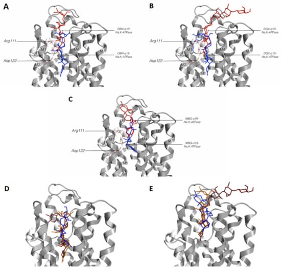 Superposition of cardiotonic steroids (CTSs) in α1S- and/or α1R-Na,K-ATPase docking models. CTSs’ positions in the CTSs-binding site of α1S and α1R-Na,K-ATPase for: (A)—ouabain, (B)—digoxin, (C)—marinobufagenin. Arg111 and Asp122 are colored in pink, CTSs interacting with α1R-Na,K-ATPase are colored red, with α1S-Na,K-ATPase colored in blue. (D)—Position of ouabain (orange), digoxin (red) and marinobufagenin (blue) in α1S-Na,K-ATPase. (E)—Position of ouabain (orange), digoxin (red) and marinobufagenin (blue) in α1R-Na,K-ATPase. Models based on the 4HYT structure of Na,K-ATPase. OBN—ouabain; DGX—digoxin; MBG—marinobufagenin.