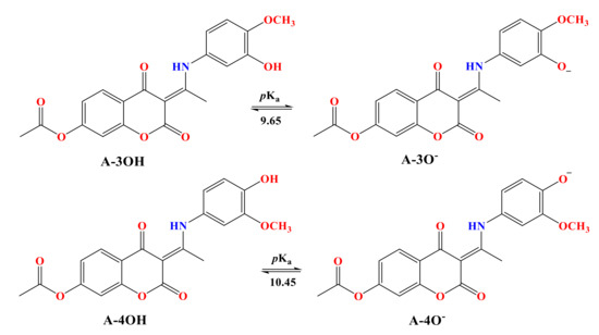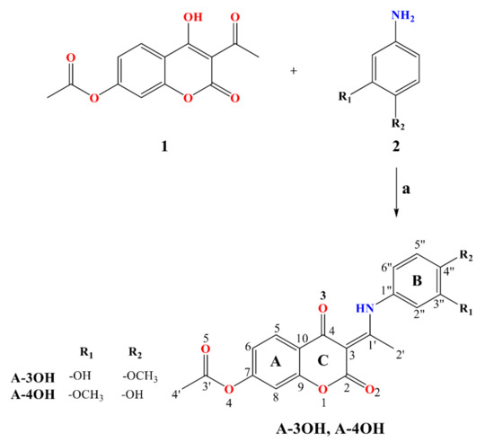Compound 3-acetyl-4-hydroxy-2-oxo-2H-chromen-7-yl acetate (1) was prepared as described in reference [33]. New coumarin derivatives (A-3OH and A-4OH) were synthesized in the reaction of the previously synthesized compound 1 and aniline derivatives (2) (0.002 mol): 4-amino-2-methoxyphenol and 5-amino-2-methoxyphenol, at 3h reflux in ethanol (50 mL) (Scheme 1). The progress of the reaction was monitored by thin-layer chromatography (TLC) (toluene:acetone = 7:3). When the reaction was complete, the resulting mixture was cooled to room temperature and the precipitate was collected by filtration. The obtained products were later purified from ethanol. All newly synthesized compounds were characterized by elemental analysis, 1H NMR, 13C NMR, and IR spectroscopy.