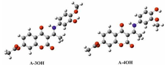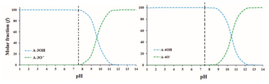 As shown in Figure 2, the possible deprotonation route happens through the –OH group. The pKa values differ for almost one unit between A-3OH (9.65) and A-4OH (10.45). It is important to notice that the position and presence of the –OH group were discussed as the main factors influencing the radical scavenging activity towards HO•. The proportion of neutral and deprotonated acid–base species varies depending on pH values. In the pH range values below 8, both compounds almost exclusively exist in neutral form. In the range of 9 < pH < 10 neutral and deprotonated acid–base forms are represented in the different percentages. In a much more alkaline medium of pH > 11, deprotonated forms are dominant in the largest percentage. This means that if the –OH group is deprotonated, mechanisms that don’t include direct hydrogen atom transfer from the electronegative group are the dominant ones. At the physiological pH, the neutral acid–base species is represented in the largest molar fraction (99.4% for A-3OH and 99.9% for A-4OH). Due to this fact, further theoretical investigations are performed on the neutral species A-3OH and A-4OH.