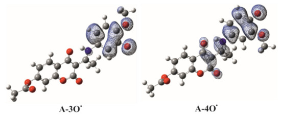 The optimized geometries of the investigated compounds are shown in Figure 4. The changes in the Gibbs reaction energies (ΔrG) for the given mechanisms are listed in Table 1. The possible reaction centers for HAT, SPLET, and SET-PT mechanisms are the –OH groups, while for RAF all of the carbon atoms of 4,7-dihydroxycoumarin and aromatic substituent are included. Concerning the HAT mechanism (Table 1), it is clear that A-4OH (−141 kJmol−1) exhibits a slightly better ability to neutralize HO• than A-3OH (−135 kJmol-1), which is supported by the experimental results. The explanation for the reactivity towards radical species lies in the stability of the newly formed radical species (Figure 5 and Figure S1) and extended delocalization of the unpaired electron within the structure of A-4O•. Lower spin density is located on the O-4 atom of A-4O• (0.321e) when compared to the same atom of A-3O• (0.330e) which is a consequence of better delocalization of the unpaired electron (Figure S4).
