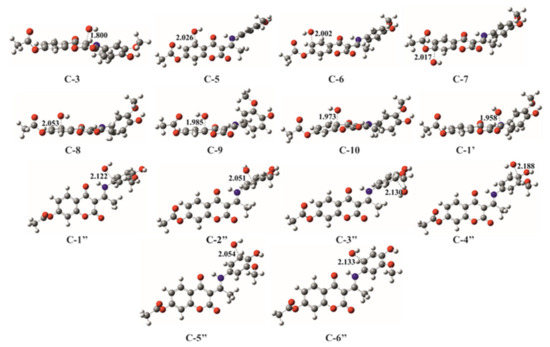 As shown in Scheme 2, the first step RAF-iHAA involves the formation of adducts in adjacent positions of the –OH group (C2”, C4” positions of A-3OH and C3”, C5” positions of A-4OH). This reaction flows through the transition state geometries (Figure 6), thus forming a radical adduct (Figures S5 and S6) that is at a lower energy level than the reactants. These radicals can be stabilized by delocalization of the spin density via the parent molecule (Figure S11) or by an intramolecular reaction followed by the separation of one molecule of water. Intramolecular separation of water goes through the geometry of the transition state (Figure 7), which leads to the formation of a radical that is obtained by hydrogen atom abstraction. The geometries of transition states for all reactions which take place via iHAA were confirmed by IRC calculation (Figures S12–S15).