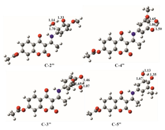 Another, less probable, reaction pathway for the reaction of HO• with investigated compounds is RAF, with the ΔGa values between 34 and 57 kJmol−1. All positions on the coumarin part of the molecules, as well as on the aromatic ring B, were examined. The obtained values for rate constants are given in Table 2–while the optimized geometries of the corresponding transition states are presented in Figure 6 and Figure 6 and Figure S6. As can be seen by comparing the values of thermodynamic and kinetic parameters, the values of the rate constant correlate well with the thermodynamic parameters. It means, that the thermodynamically most favorable positions are in good accordance with kinetically most favorable positions. It is obvious that the aromatic ring significantly contributes to the improvement of antioxidant properties of these compounds because the rate constants of chemical reactions with the investigated radical are in some cases up to 1000 times faster than for the rest of carbon atoms, Table 2. The kinetic results also follow the experimentally determined higher reactivity of A-4OH, as the ΔGa values are lower for several kJmol−1.