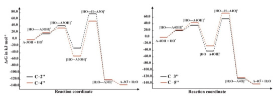 Corresponding energy profiles of reactions of A-3OH (C2″ and C4″) and A-4OH (C3″ and C5″) with HO• are presented in Figure 8, Analysis of the data from Table 2 as well as the energy profile for the iHAA reaction (Figure 8) shows that this reaction step is much slower than the first step, and this step determines the rate of a chemical reaction. Nominal values of activation energies for positions C-2” and C-4” at A-3OH and C-3″ and C-5″ at A-4OH are slightly more than 100 kJ mol−1 (Table 2). Such relatively high values of activation energy indicate the fact that the second step, the separation of water molecules from radical adducts, is very slow at room temperature. The values of the reaction rate constants, which are of the order of 10−5 s−1, also support this.