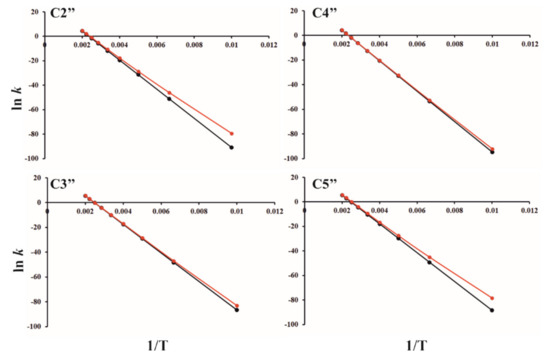 Dependence of lnkTST (black) and lnkZCT_0 (red) on reciprocal temperature for intramolecular reaction (iHAA mechanism): [HO-A-3OH]• (up), [HO-A-4OH]• (down).