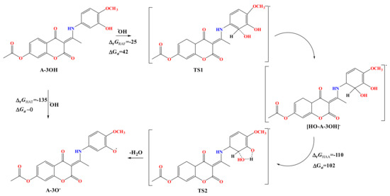 Electron transfer (SET, Equation (6)) between neutral forms of investigated compounds and HO• is not thermodynamically favorable, which is reflected in the distinctly endergonic ΔrGSET values for A-3OH (ΔrGIP = 105 kJmol−1) and A-4OH (ΔrGIP = 100 kJmol−1) (Table 1). Therefore, this mechanism is not thermodynamically plausible and is excluded from the kinetic studies.
