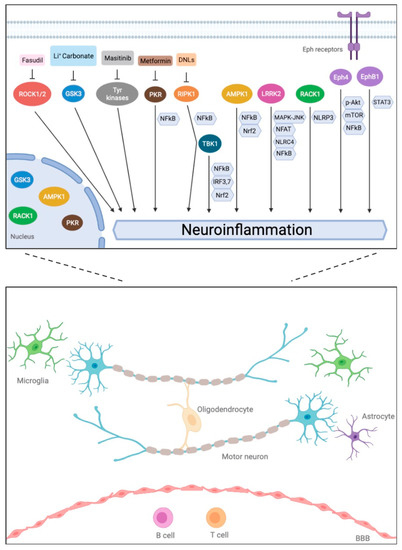 Indeed, apart from the various studies revealing the dysregulated expression of inflammatory-related genes and proteins in ALS patient tissues [3], and the implication of several signaling kinases in the pathophysiology of ALS [14], the recent discovery of TBK1 as an ALS-causing gene [15,16] suggests a direct link between neuroinflammation and signaling kinases in ALS and other related diseases.