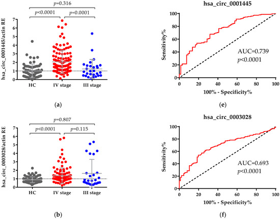 In our study we found that expression of the four circRNAs—hsa_circ_0001445, hsa_circ_0003028, hsa_circ_0007915 and hsa_circ_0008717—was significantly increased in the plasma of patients with advanced disease as compared to healthy controls. Furthermore, we found that two of those, hsa_circ_0004515 and hsa_circ_0007915, could significantly distinguish between patients in stage III and patients in stage IV with a moderate accuracy with AUC = 0.729 and AUC = 0.714, respectively. With regard to hsa_circ_0001445, our results allow us to identify it as a novel prognostic marker for metastatic CRC patients. We found that a panel of hsa_circ_0001445 and hsa_circ_0007915 had a robust diagnostic value as a means to differentiate between patients in stage III from those in stage IV (90.98% sensitivity and 60.71% specificity).
