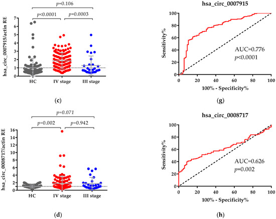 Relative expression (RE) of circRNAs: (a) comparison between levels of hsa_circ_0001445, (b) hsa_circ_0003028, (c) hsa_circ_0007915 and (d) hsa_circ_0008717 in plasma samples from healthy controls (HC) and patients with CRC in stages III and IV. The expression levels of all circRNAs were measured using qPCR. β-actin RNA was used as an internal control. Relative gene expression level was calculated using the 2−ΔΔCt method. The Mann–Whitney U test was used to compare HC and CRC patients; data are presented as mean ± SD. ROC curves of (e) hsa_circ_0001445, (f) hsa_circ_0003028, (g) hsa_circ_0007915 and (h) hsa_circ_0008717 differentiate patients with CRC from HC.