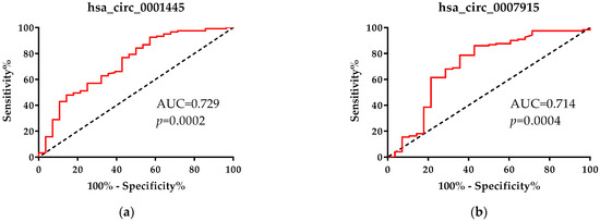 ROC analysis and ROC curves using (a) hsa_circ_0001445 and (b) hsa_circ_0007915 to differentiate patients with CRC in stage IV from patients in stage III.