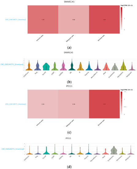(a) Differential gene expression of hsa_circ_0001445 (SMARCA5) in malignant cells and immune and stromal sells; (b) Detailed presentation of expression levels of SMARCA5 gene in TME; (c) Differential gene expression of hsa_circ_0007915 (IPO11) in malignant cells and immune and stromal cells; (d) Detailed presentation of expression levels of IPO11 gene in TME. Visualizations were generated using TISCH database including single-cell transcriptome profiles [37].