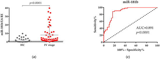 Many studies observed the functional mechanisms of circRNAs to modulate the pathological processes of cancer and the main one among these was via sponging of an miRNA or miRNAs. According to Ren et al. (2017) and Yu et al. (2018), miR-106a and miR-181b are sponged by hsa_circ_0007915 and hsa_circ_0001445, respectively [9,17]. If these miRNAs are targets for circRNAs, their levels would be dysregulated. To test this hypothesis we examined the expression of miR-181b and miR-106a in our CRC patients. These analyses were performed only for stage IV patients (n = 62) and for HC. We found that both miRNAs were differentially expressed at significantly higher levels in the plasma of CRC patients and not in healthy controls (p < 0.0001, Figure 5a; p < 0.0001, Figure 5b). Analyses of the ROC curve confirmed that the expression of the two miRNAs in plasma distinguished CRC patients in stage IV from healthy controls (Figure 5c,d). Comparing the two miRNAs we found that miR-181b exhibited greater diagnostic power with an AUC value of 0.891 (95% CI: 0.84–0.94, p < 0.0001, Figure 5c), with 88.24% sensitivity, and with 83.33% specificity at Youden Index 0.716 than the miR-106a with an AUC = 0.774 (95% CI: 0.70–0.85, p < 0.0001, Figure 5d), with 84.38% sensitivity and 64.44% specificity at larger Youden Index 0.488.