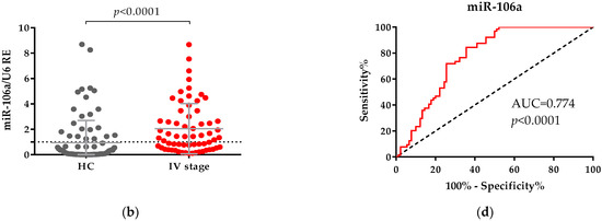 Comparison between levels of (a) miR-181b and (b) miR-106a in plasma samples from healthy controls (HC) and patients with CRC in stage IV. The expression levels of both miRNAs were measured using qPCR in plasma from CRC patients and HC. U6 RNA was used as an internal control. Relative gene expression (RE) was calculated using the 2−ΔΔCt method. The Mann–Whitney U test was used to compare the two groups—HC and CRC patients; data are presented as mean ± SD. ROC curves of (c) miR-181b and (d) miR-106a used to differentiate patients with metastatic CRC from HC.