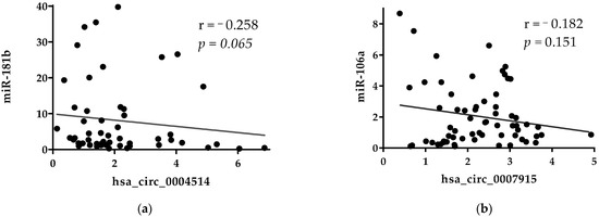 We performed a correlation analysis to see whether the levels of miRNAs in plasma would correlate to the levels of circRNAs. No significant correlations were found between the plasma level of miRNAs and circRNAs (Figure 6a,b). As shown in Figure 6a, there was a trend of weak negative correlation between the levels of miR-181b and hsa_circ_0001445. This result provides a possibility, albeit indirectly, of hsa_circ_0001445 sharing binding sites with miR-181b.