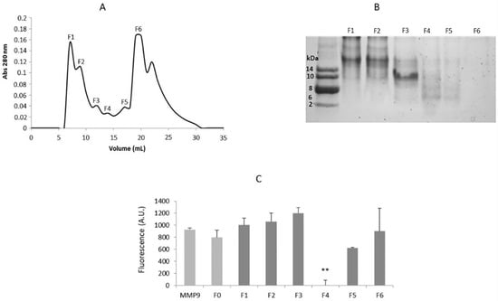 As observed in Figure 1, throughout the protein profile shown in Figure 1A, only fraction F4 presented significant MMP-9 inhibition (p < 0.001) and corresponded to a low molecular mass fraction (<20 kDa), which is in accordance with the study previously presented by Lima et al. [], where reverse zymography results suggested that the MMPI protein/polypeptide had a molecular mass lower than 20 kDa.