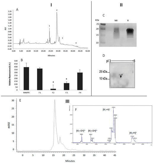 Separation of the SEC fraction 4 (Figure 1) by RP-HPLC chromatography yielded different peaks, with different effects on MMP-9, with peak 2 presenting the highest inhibitory activity, as demonstrated by Figure 2B (Figure 2—I). This peak (RP-HPLC fraction 2) was further analyzed by 1D electrophoresis, under reducing and non-reducing to determine the potential presence of disulphide bonds and 2D electrophoresis. The results are shown in Figure 2C,D (Figure 2—II) and show the presence of different polypeptide bands in both conditions, suggesting an oligomer with the presence of disulphide bonds—possibly one or more interchain disulphide bonds—as judged by the difference in polypeptide patterns between lanes NR and R in Figure 2C, where the MMPI band does not present marked differences in mass when exposed to reducing or non-reducing conditions. It is noteworthy to observe that the protein band mass presented here is around 20 kDa, which seems to differ from Figure 1B which suggests a protein band of around 14 kDa; however, tricine-SDS PAGE would present a higher resolution of the low molecular weight bands, which can explain the apparent difference in masses.
