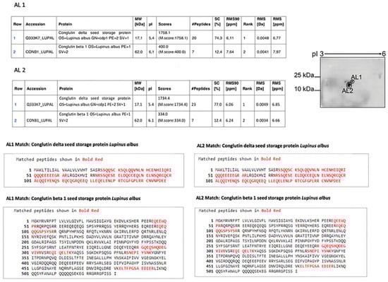 The two spots of the MMPI fraction obtained by 2D electrophoresis were named AL1 and AL2, and they were collected and sequenced by MS analysis. The sequence results for both spots are described below in Figure 3.