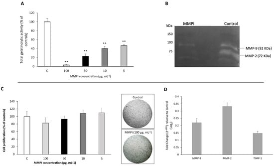 Figure 4 shows the in vitro effect of the L. albus MMPI on HT29 cells, namely on total and specific gelatinase activity (Figure 4A,B), cell proliferation (Figure 4C), and MMP-2 and MMP-9 gene expression (Figure 4D). A set of four different concentrations of the isolated MMPI (100, 50, 10, and 5 µg·mL−1) was tested in vitro for total MMP-2 and MMP-9 inhibition using the DQ-gelatin method, as displayed in Figure 4A.