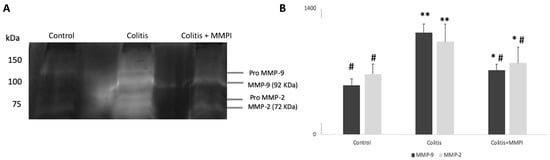Effect of the L. albus MMPI administration on the colon tissue gelatinase activities of MMP-2 and MMP-9 from colitis-induced mice. (A): Representative image of the zymographic profiles of MMP-9 and MMP-2 activities of the colons. Protein extracts of the colon were loaded on 12.5% (w/v acrylamide) polyacrylamide gels co-polymerized with 1% (w/v) gelatin. (B): Densitometric analysis of the gelatinolytic activity of MMP-9 and MMP-2 obtained in the zymographies. Control group (n = 6); Colitis group (n = 10); Colitis + MMPI =colon from animals treated with L. albus MMPI (15 mg·kg−1, n = 9, p.o.). Results are average of at least three replicates. # p < 0.05 vs. Colitis; * p < 0.05 vs. Control and ** p < 0.001 vs. Control.