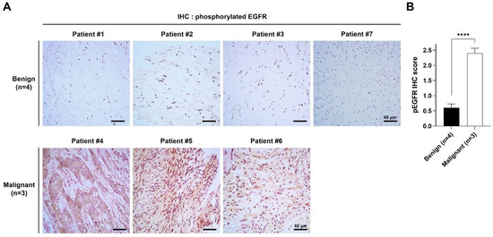 Phosphorylated EGFR is upregulated in MPNST. (A) Histologic analysis by immunohistochemical staining using phospho-EGFR (pEGFR) antibody was performed on tumor tissue sections. Scale bar = 60 μm (400×). (B) Quantitative analysis of immunohistochemical staining of pEGFR. pEGFR-positive cells (brown) and nuclei (blue) were analyzed from four different parts of each slide, and pEGFR IHC score was calculated using ImageJ software. The data are presented as mean ± standard error of mean (SEM). Two-tailed paired t-test was used for the statistical analysis. ****, p < 0.0001.