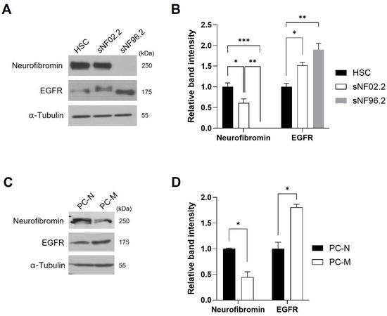Co-expression pattern of neurofibromin and EGFR expression in MPNST cells. (A) Western blot analysis of neurofibromin and EGFR in HSC, sNF02.2 and NF96.2 2. (C) Western blot analysis of EGFR and neurofibromin in primary normal PC-N cells and malignant PC-M cells. (B,D) Immunoblot band density of specific proteins was normalized to the signal intensity of α-tubulin internal control for each sample. The western blot analysis was repeated at least three times with comparable results. Relative band intensity was quantified using ImageJ software. One-way analysis of variance (ANOVA) followed by Tukey’s honest significant difference (HSD) post-hoc test was used for the statistical analysis in (B), and two-tailed paired t-test was used for the statistical analysis in (D). *, p < 0.05, **, p < 0.01 and ***, p < 0.001.