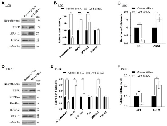 Correlation of the expression levels between neurofibromin and EGFR. The protein expressions of NF1 and EGFR were examined by western blot analyses following siRNA transfection in (A) human Schwann cells (HSCs) and (D) primary cultured normal (PC-N). (B,E) Immunoblot band density of specific proteins was normalized to the signal intensity of α-tubulin internal control for each sample. The western blot analysis was repeated at least three times with comparable results. Relative band intensity was quantified using ImageJ software. *, p < 0.05, **, p < 0.01 and ***, p < 0.001. (C,F) mRNA expression levels of NF1 and EGFR were evaluated by real-time quantitative RT-PCR after 3 days of transfection. Two-tailed paired t-test was used for statistical analysis. *, p < 0.05 and **, p < 0.01.