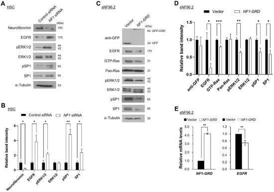 Changes in the EGFR, Ras, ERK1/2, and SP1 levels in the neurofibromin-depleted and neurofibromin-overexpressed cells. (A) Western blot analysis of the effect of NF1 siRNA and its downstream signaling pathways in HSCs. (C) sNF96.2 cells were transfected with an empty vector or GFP-tagged NF1-GRD. A total of 24 h after transfection, expression levels of the indicated proteins were determined by immunoblotting. (B,D) Immunoblot band density of specific proteins was normalized to the signal intensity of α-tubulin internal control for each sample. The western blot analysis was repeated at least three times with comparable results. Relative band intensity was quantified using ImageJ software. Two-tailed paired t-test was used for statistical analysis. *, p < 0.05, **, p < 0.01 and ***, p < 0.001. (E) The mRNA levels of EGFR or NF1-GRD were examined by quantitative RT-PCR. Two-tailed paired t-test was used for statistical analysis. **, p < 0.01.