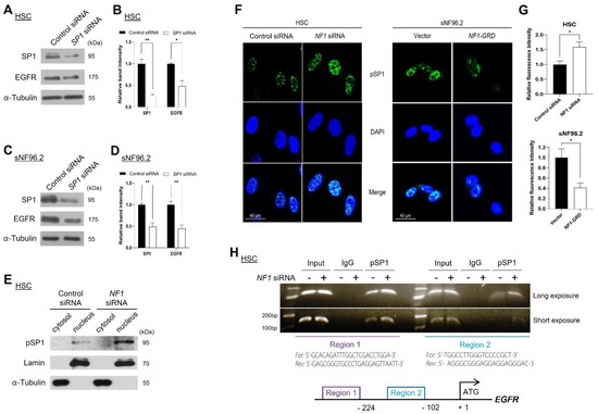 To determine the pSP1-binding site on the EGFR gene in HSCs, we conducted a site-specific ChIP assay using an anti-pSP1 antibody, as described in a previous report [29]. The ChIP assay results showed that NF1 knockdown augmented pSP1 binding to both regions (regions 1 and 2) on the EGFR promoter (Figure 6H). These results indicate that neurofibromin regulates the nuclear localization of SP1 and binding of SP1 to the EGFR gene promoter.