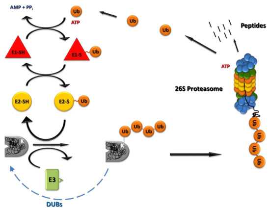 The ubiquitin–proteasome system (UPS), also known as the ubiquitin–proteasome pathway (UPP), is the major non-lysosomal system for degrading proteins in eukaryotic cells [1]; it is responsible for the degradation of 80–90% of all cellular proteins [2]. The discovery of ubiquitin (Ub), a ubiquitous and highly conserved protein of 76 amino acid residues, and the understanding of the critical role of the UPS in protein degradation [3,4] was recognized by the 2004 Nobel Prize for Chemistry awarded to Avram Hershko, Aaron Ciechanover, and Irwin Rose. As the principal pathway for degrading cellular proteins, the UPS serves two main functions: (1) a major regulatory function (i.e., targeted degradation of a variety of short-lived regulatory proteins involved in cell cycle control, signal transduction cascades, and regulation of gene expression and metabolic pathways) and (2) the quality control function (i.e., removal of damaged, misfolded, and functionally incompetent proteins).