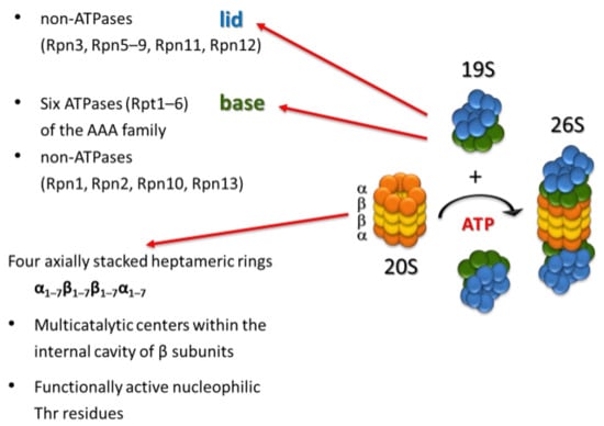 The 26S proteasome (Figure 2) is composed of the 20S proteolytic core (20S proteasome or core particle, CP) that is capped at one or both ends by the 19S regulatory complex (regulatory particle, RP) [5,6,7,8]. The 19S regulatory complex confers ubiquitin and ATP dependency to proteolysis, and the 20S proteasome provides the proteolytic activities needed to degrade substrates (Figure 3). The RP is an ~19-subunit complex responsible for recognition and processing of ubiquitinated substrates, and it can be biochemically divided into base and lid subcomplexes [9,27,28,29]. The base is composed of six AAA ATPases (regulatory particle triple-A proteins)—Rpt1–Rpt6 (required for substrate unfolding and translocation into the CP), regulatory particle non-ATPase (Rpn) proteins Rpn1 and Rpn2 (S2 and S1 in humans), and ubiquitin receptors Rpn10 (S5a) and Rpn13. The lid contains nine Rpn subunits (Rpn3, Rpn5–Rpn9, Rpn11, Rpn12, and Rpn15/Sem1 in yeast), including the deubiquitinating enzyme Rpn11, whose activity is essential for efficient substrate degradation [30,31].