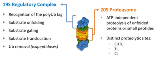 After binding to the proteasome, polyubiquitinated protein substrates are unfolded, deubiquitinated, and translocated into the proteolytic core where they are degraded into small peptides. The 20S catalytic core is a cylindrically shaped structure formed by 28 subunits arranged as four stacked heteroheptameric rings (α1–7β 1–7β1–7α 1–7) [25]. The two distal rings are composed of non-proteolytic α-type subunits, while the two inner rings of β-type subunits form the central proteolytic chamber. Each β-ring contains three active sites with distinct substrate specificities. The active site of the β1 subunit cleaves after acidic residues (caspase-like, CL), β2 cleaves after basic residues (trypsin-like, TL), and β5 cleaves after hydrophobic residues (chymotrypsin-like, CHTL). Unlike conventional proteases, all three proteolytic sites in the 20S proteasome utilize their N-terminal threonine residue as the catalytic nucleophile [32,33,34].