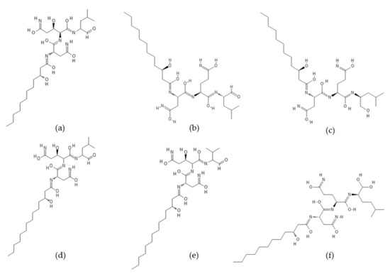 Peptide aldehydes like MG132 (Z-Leu-Leu-Leu-al) are known inhibitors of proteasomes [55,86,87]. Fellutamide B, a fungal lipopeptide containing an aldehyde moiety, has been shown to inhibit human proteasomes and induce nerve growth factor (NGF) synthesis [85]. Fellutamide B potently inhibits the chymotrypsin-like activity of the human proteasome with an IC50 value of 9.4 ± 2.5 nM. The trypsin-like and caspase-like activities are also inhibited by fellutamide B, but to a lesser extent (IC50: 2.0 ± 0.4 µM and 1.2 ± 0.8 µM, respectively). Treatment of LM mouse fibroblasts with fellutamide B led to accumulation of ubiquitinated proteins, confirming its ability to inhibit proteasomes within cells. The crystal structure of the yeast 20S proteasome in complex with fellutamide B has revealed its mechanism of inhibition via formation of a covalent hemiacetal bond between the functional aldehyde group and the Thr1 γ-oxygen at the active site of the proteasome [85]. The peptide backbone of fellutamide B adopts similar conformations, while the long β-hydroxy aliphatic tail assumes different orientations at each of the β5, β2, and β1 catalytic sites. Kinetic studies have revealed that fellutamide B inhibits the human proteasome β5 active site following a two-step binding mechanism with Ki = 11.5 nM and K*i = 0.93 nM [88]. Fellutamide B has also been identified as the most potent inhibitor of the β5 active site of the Mycobacterium tuberculosis (Mtb) proteasome [88]. A single-step binding mechanism with Ki = 6.8 nM has been demonstrated for inhibition of the Mtb proteasome by fellutamide B. Two other lipopeptide aldehydes, fellutamides D and E, were potent in inhibiting the chymotrypsin-like activity of the C. albicans proteasome with an IC50 value of 0.2 µg/mL (0.33 µM and 0.34 µM, respectively) [82]. Inhibition of fungal proteasomes by fellutamides D and E led to inhibition of fungal growth. Because of the pharmacological potential of natural lipopeptides, total syntheses of fellutamide B as well as of other members of the fellutamide family have been achieved [84,89].