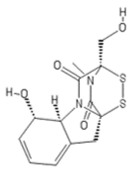 Gliotoxin (Figure 6) is the first reported and the most important epidithiodioxopiperazine (ETP)-type fungal toxin [100,101,102]. This sulfur-containing secondary metabolite (MF: C13H14N2O4S2) is characterized by an internal disulfide bridge and a diketopiperazine ring that derives from a cyclic dipeptide. Gliotoxin was originally isolated from the wood fungus Gliocladium fimbriatum and has since then been identified as an antibiotic produced by various pathogenic species of Trichoderma (e.g., T. virens), Aspergillus (e.g., A. fumigatus), and Penicillium [100]. This ETP compound, a known virulence factor in the major human pathogen A. fumigatus, has been recently reported to be also biosynthesized by its nonpathogenic relative A. fischeri [103].