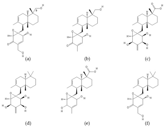 Structures of (a) epoxyphomalin A, (b) epoxyphomalin B, (c) epoxyphomalin C, (d) epoxyphomalin D, (e) epoxyphomalin E, and (f) 11-dehydroxy epoxyphomalin A.