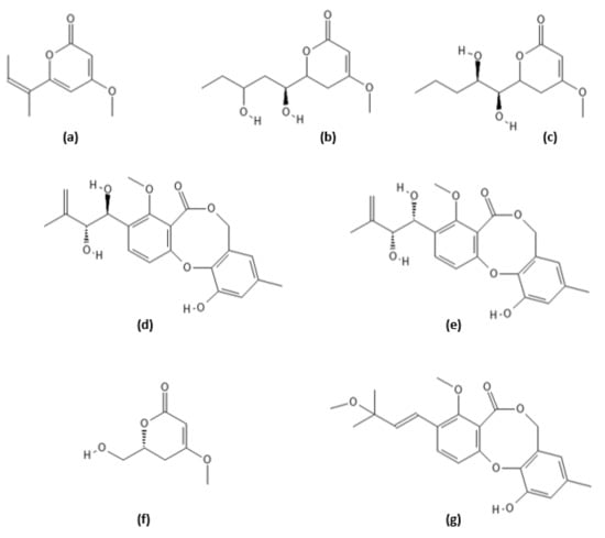Structures of secondary metabolites of Pestalotiopsis sydowiana: (a) pestalotiopyrone G, (b) photipyrone B, (c) LL-P880β lactone, (d) pestalotiollide A, (e) pestalotiollide B, (f) 6-hydroxymethyl-4-methoxy-5,6-dihydro-2H-pyran-2-one, and (g) 3′-O-methyldehydroisopenicillide.