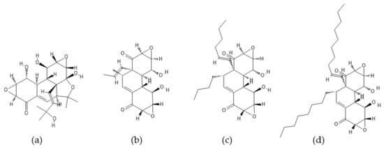 Bioactivity-guided fractionation of the mycelium extract of the ascomycete fungal pathogen Colletotrichum higginsianum has resulted in the isolation of two novel diterpenoid α-pyrones, named higginsianins A and B, with molecular formulas established as C27H38O4 and C27H40O4, respectively [138]. These compounds have been found to possess promising antiproliferative effects in a panel of six cancer cell lines including Hs683 (oligodendroglioma), U373 (glioblastoma), A549 (non-small-cell lung cancer), MCF-7 (breast carcinoma), SKMEL-28 (human melanoma), and B16F10 (murine melanoma) cell lines.