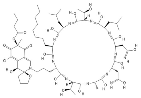 The molecular formula of chlorofusin has been identified as C63H99O19N12Cl. Its structure has been proposed to consist of a densely functionalized, azaphilone-derived chromophore linked through the terminal amine of ornithine to a cyclic peptide composed of nine amino acid residues (Figure 15) [152]. The absolute stereochemistry of the chromophore part has been determined and total syntheses of chlorofusin have been achieved [154,155,156,157]. Furthermore, chlorofusin analogs that have the ability to prevent the binding of p53 to HDM2 have been developed [158]. Two of these chlorofusin derivatives have been found to inhibit growth of SJSA-1 osteosarcoma cells. Studies of the natural product chlorofusin have also led to the identification of a new small-molecule inhibitor of the p53–HDM2 interaction [158].