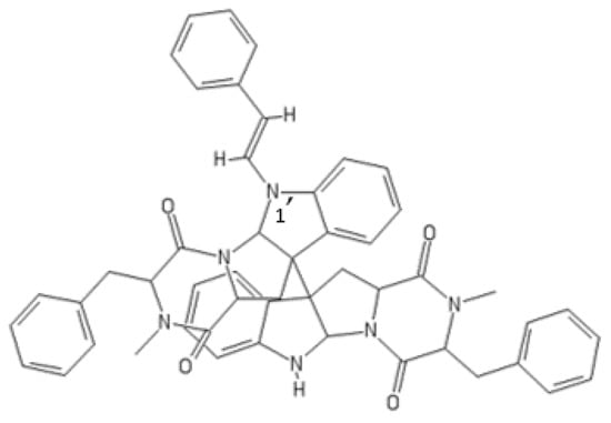 - Barrow, C.J.; Sedlock, D.M. 1’-(2-phenyl-ethylene)-ditryptophenaline, a new dimeric diketopiperazine from Aspergillus flavus. J. Nat. Prod. 1994, 57, 1239–1244. [Google Scholar] [CrossRef]
