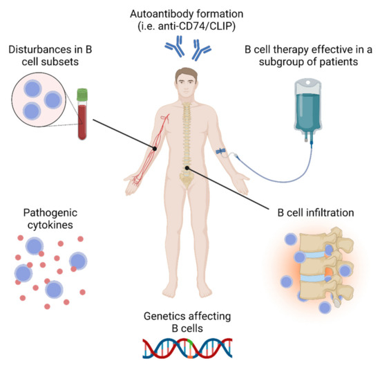 Chicago/Turabian StyleWilbrink, Rick, Anneke Spoorenberg, Gwenny M. P. J. Verstappen, and Frans G. M. Kroese. 2021. "B Cell Involvement in the Pathogenesis of Ankylosing Spondylitis" International Journal of Molecular Sciences 22, no. 24: 13325. https://doi.org/10.3390/ijms222413325